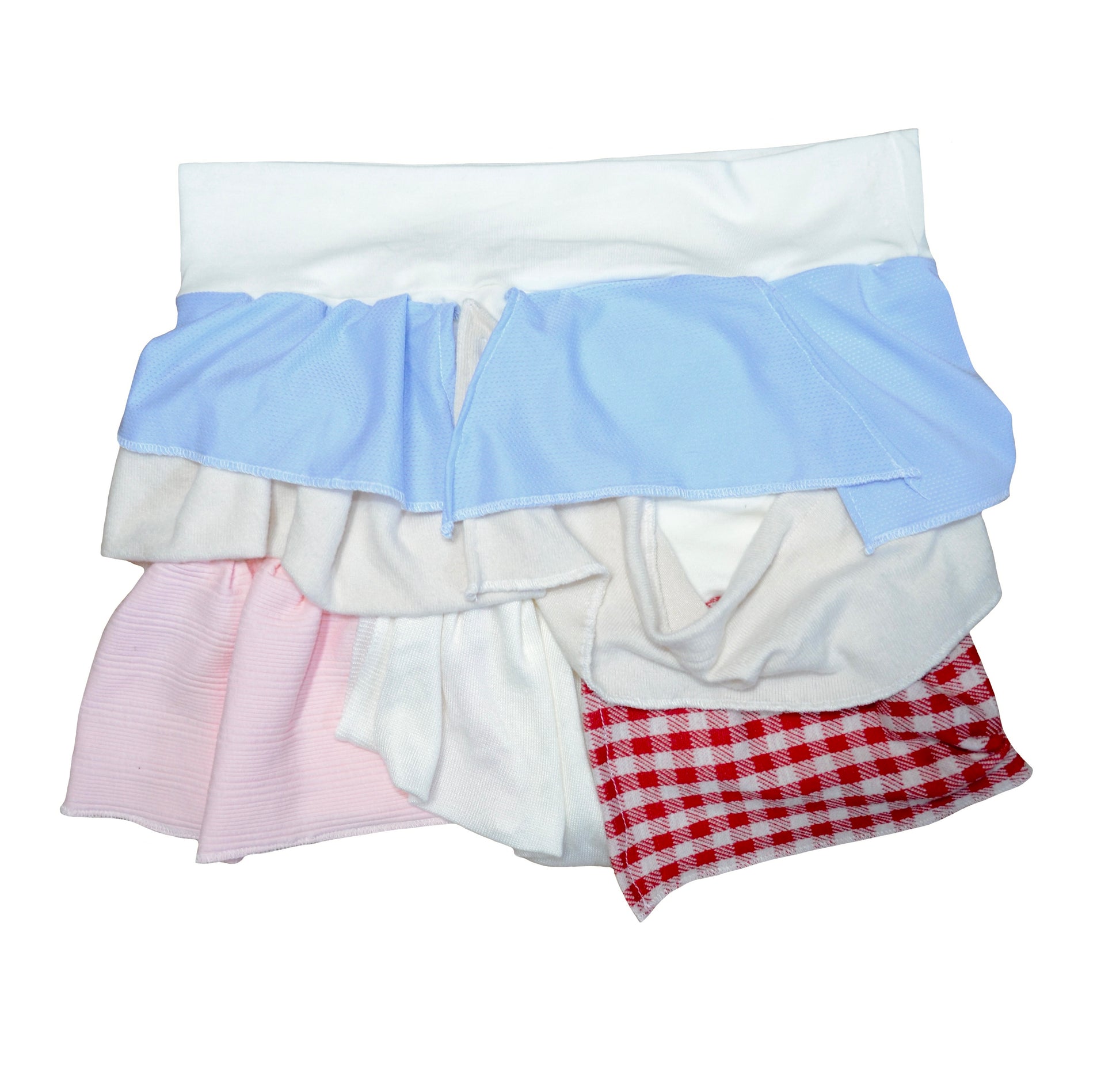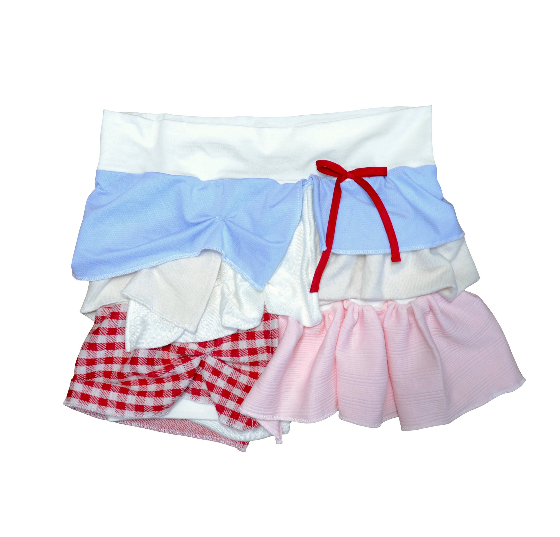 This skirt has been entirely handmade from samples of new, soft, and stretchy fabrics. Each piece of fabric has been carefully assembled to give scraps a second life and reduce textile waste.