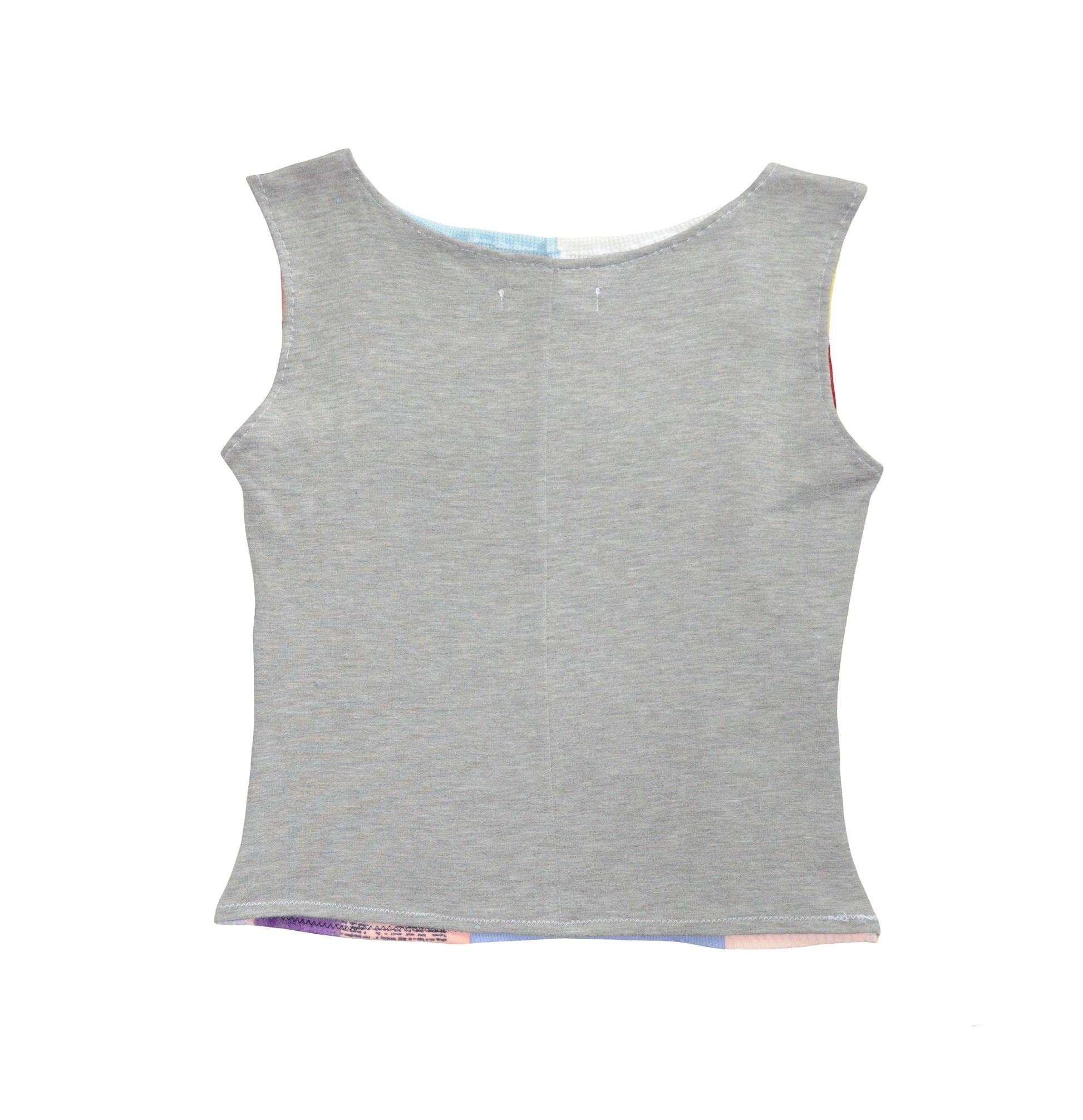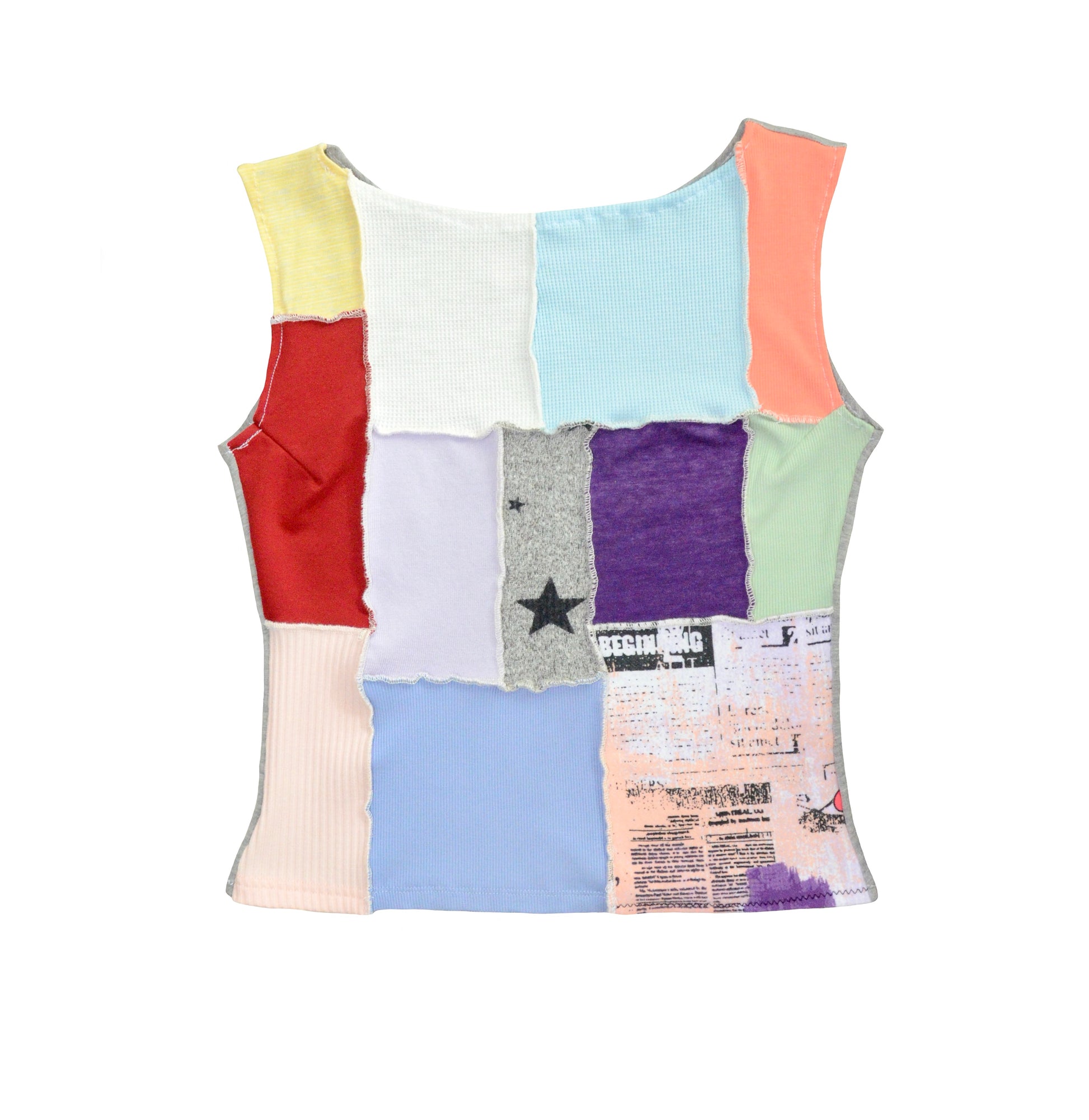 This tank top has been entirely handmade from new, soft, stretchy fabric samples. Each piece of fabric has been carefully assembled to give a second life to scraps and reduce textile waste.