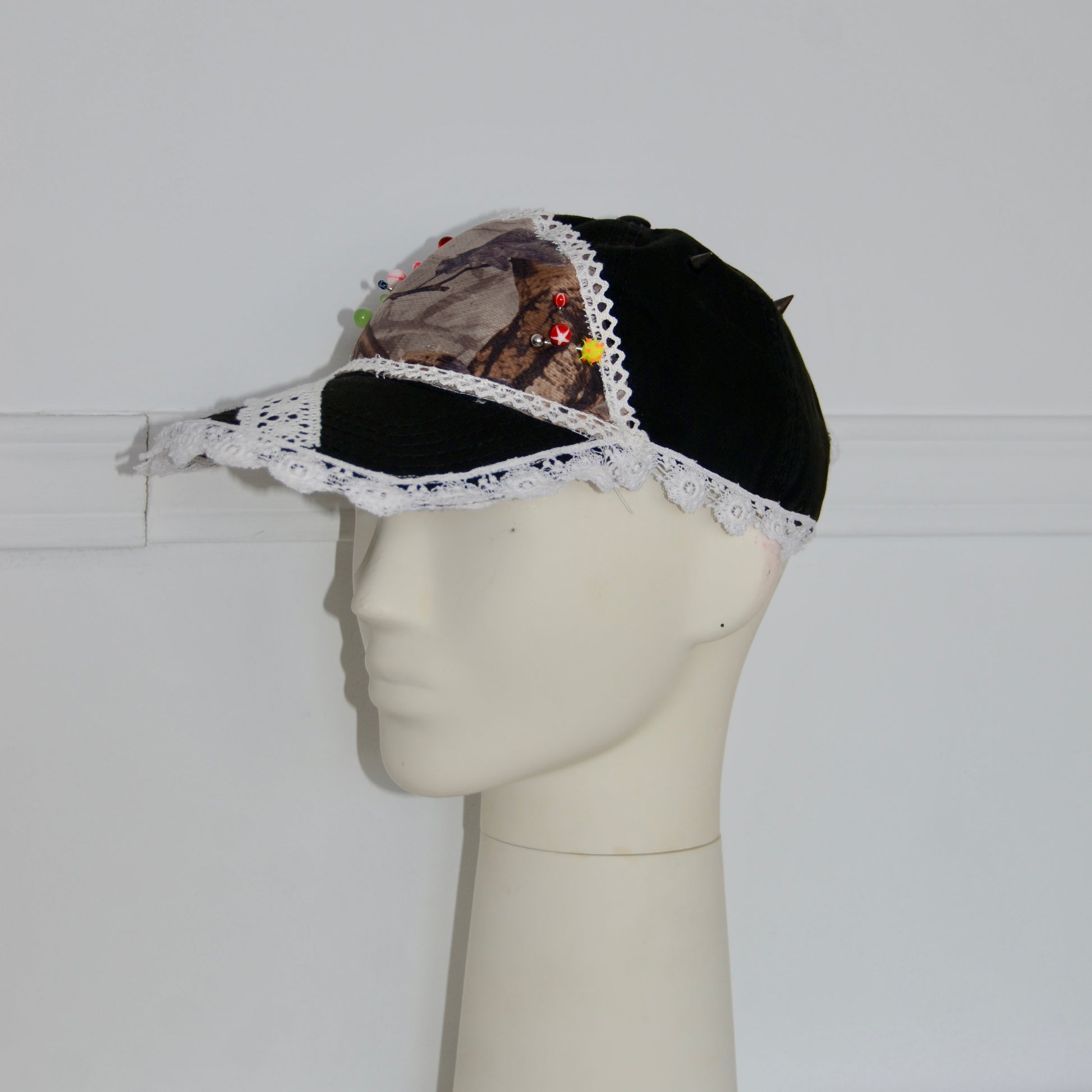 A unique piece combining contrast and audacity: this reworked black cap combines delicate lace, camouflage fabric and navel piercings for a style that's both romantic and rebellious. Made from recycled materials, it is the embodiment of assertive, eco-responsible fashion.