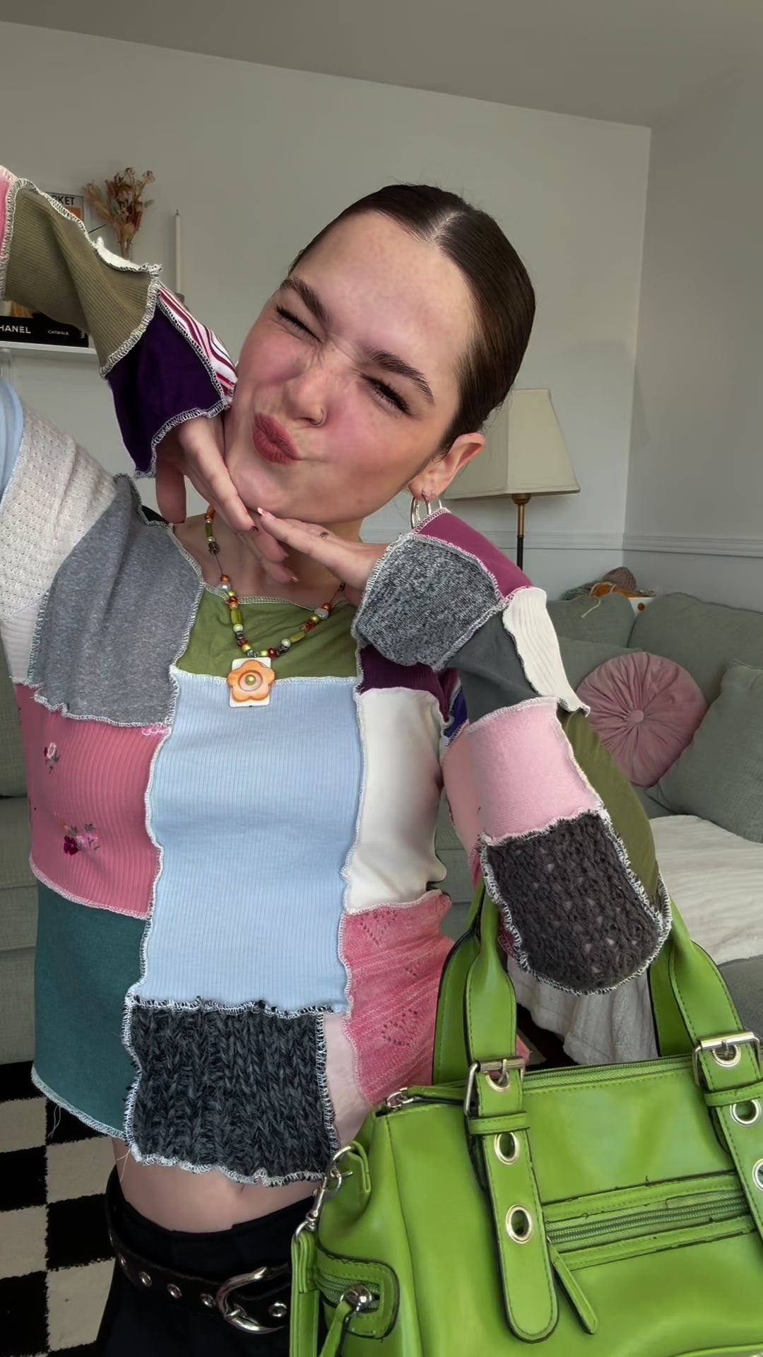 This sweater has been entirely handmade from new, soft, stretchy fabric samples. Each piece of fabric has been carefully assembled to give a second life to scraps and reduce textile waste.