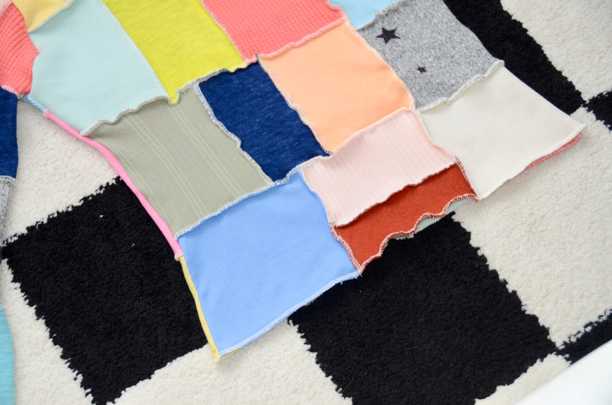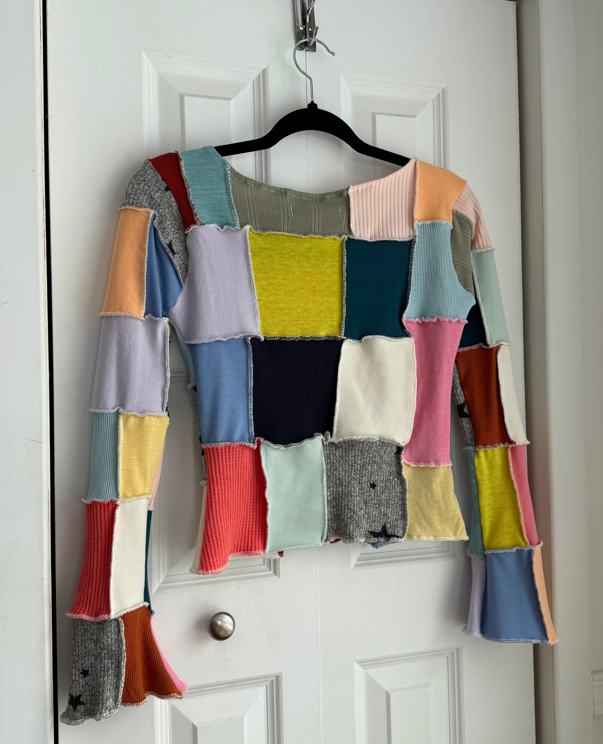 This sweater has been entirely handmade from new, soft, stretchy fabric samples. Each piece of fabric has been carefully assembled to give a second life to scraps and reduce textile waste.