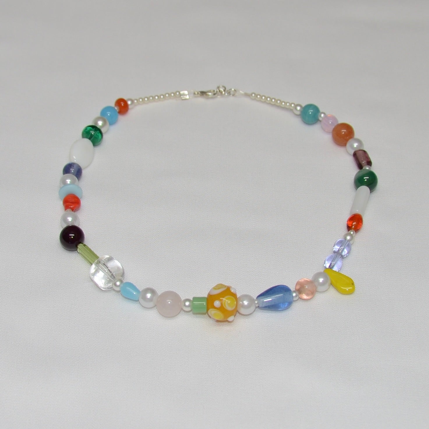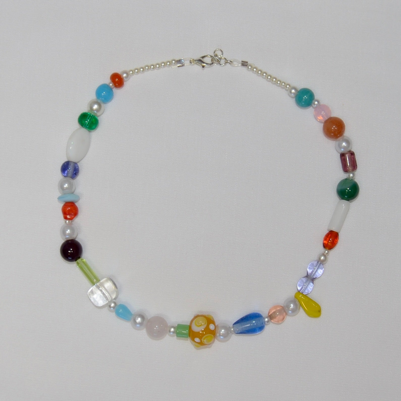 This multicolored necklace is made from old stones, blown glass and plastic beads. The perfect necklace to add a touch of fun to your look.