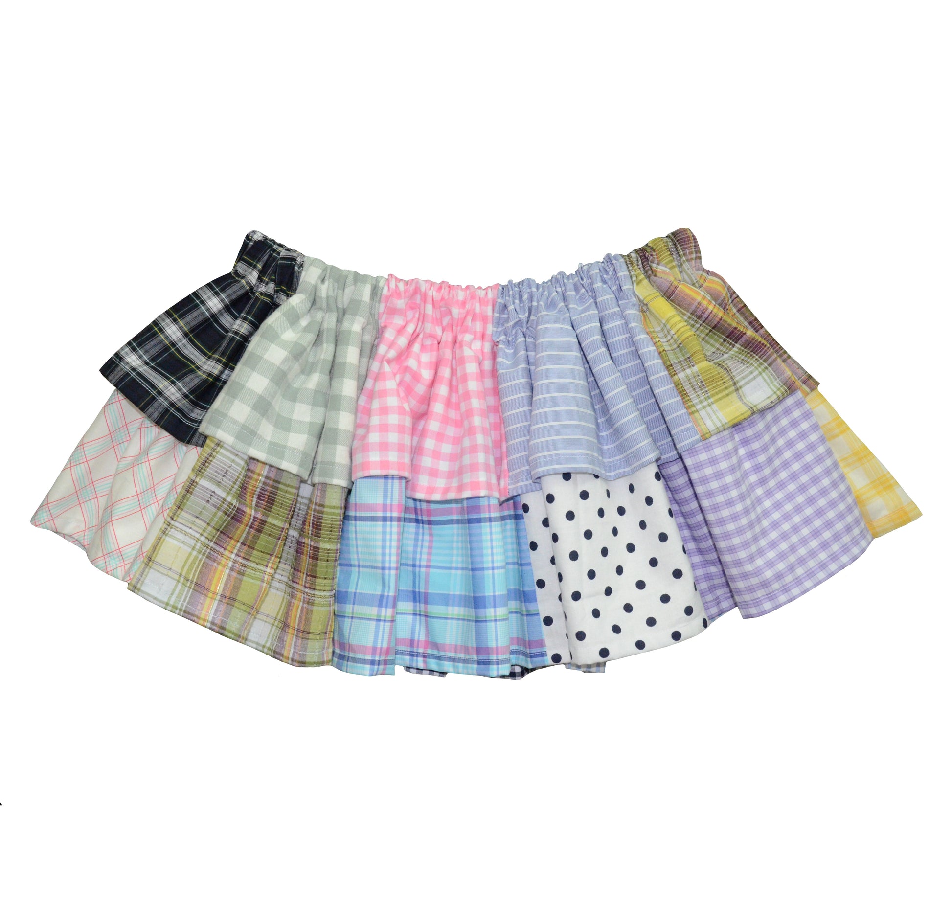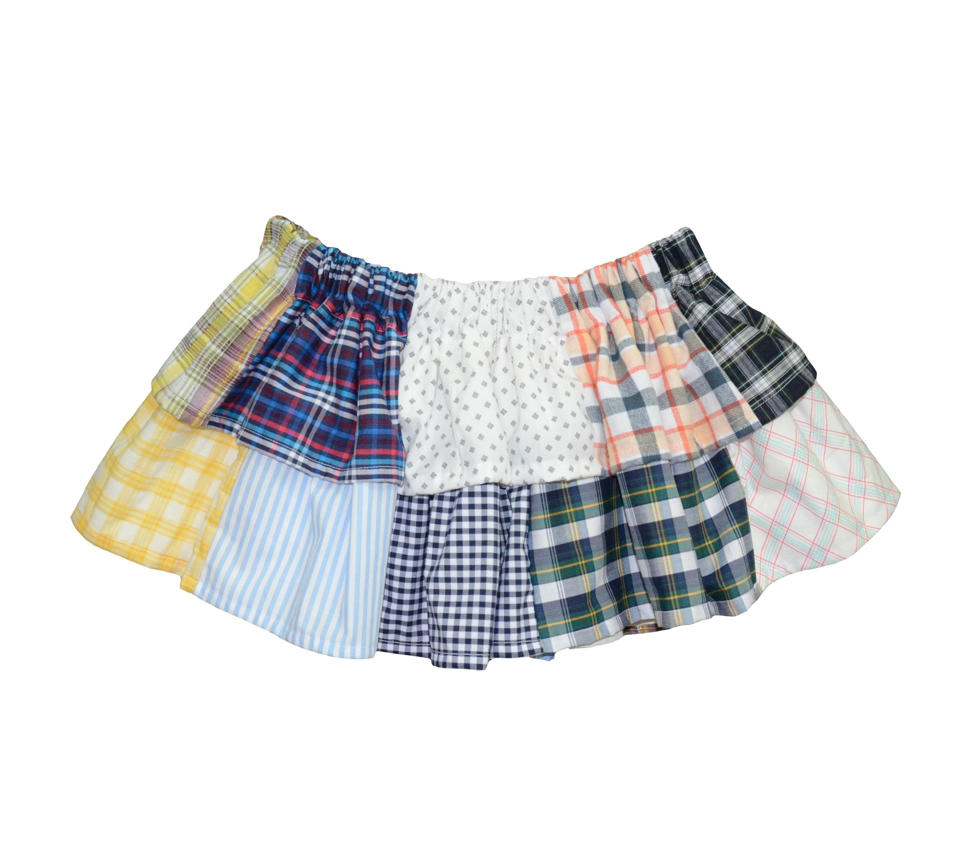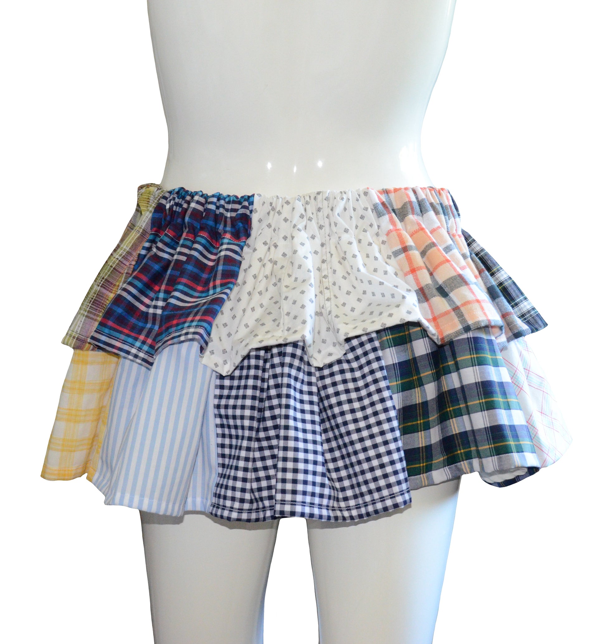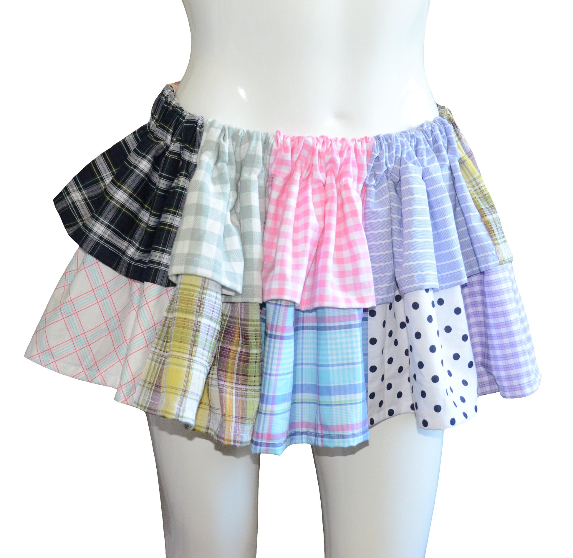 Handmade patchwork skirt made from recycled colorful and checkered fabrics. It can be worn on both sides. This skirt is one of a kind.