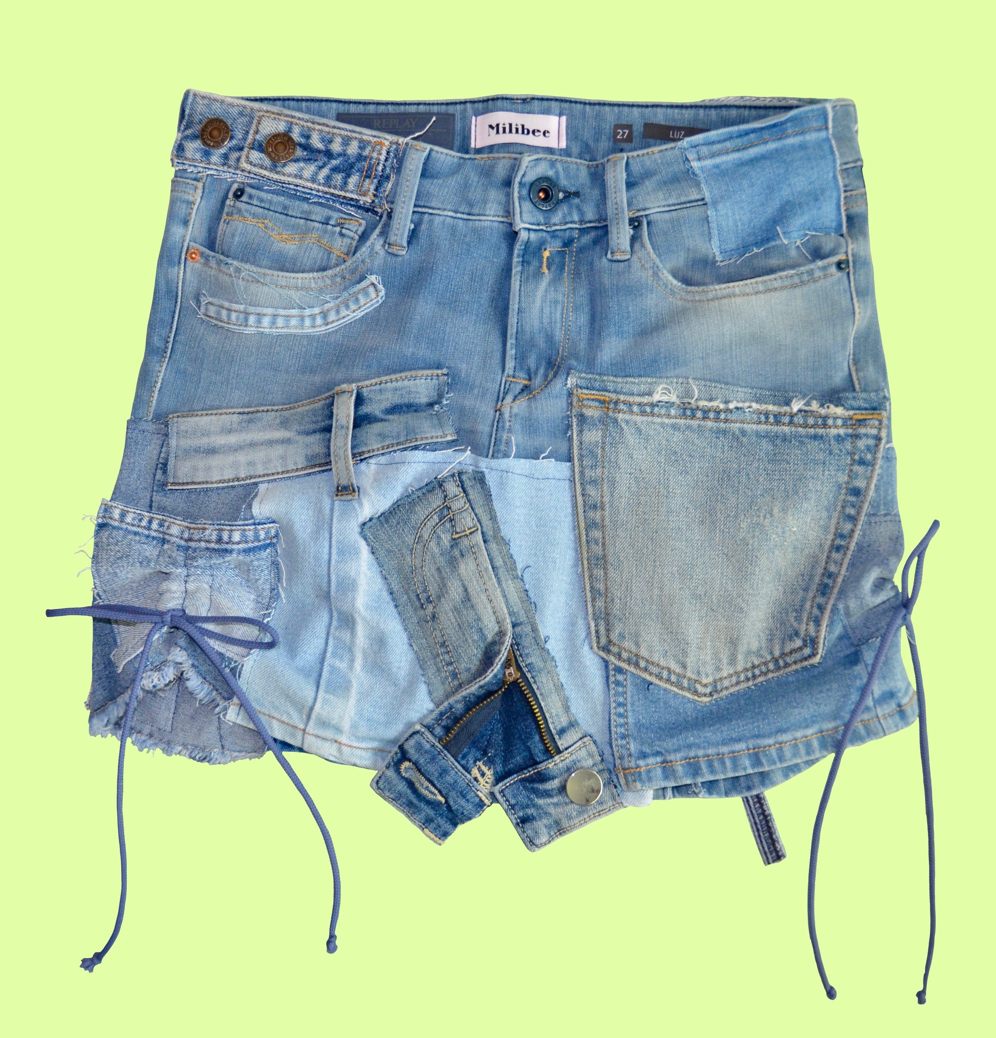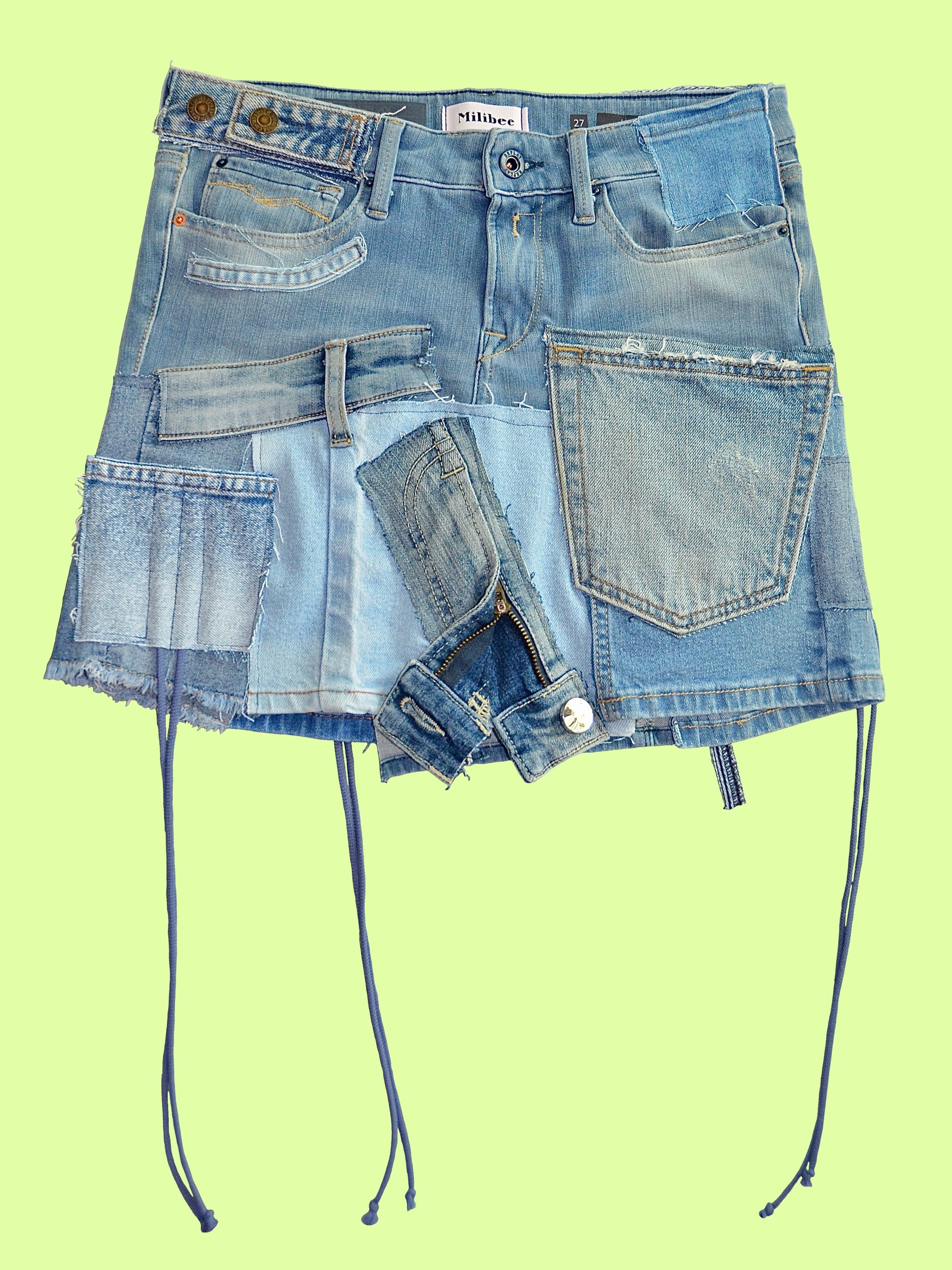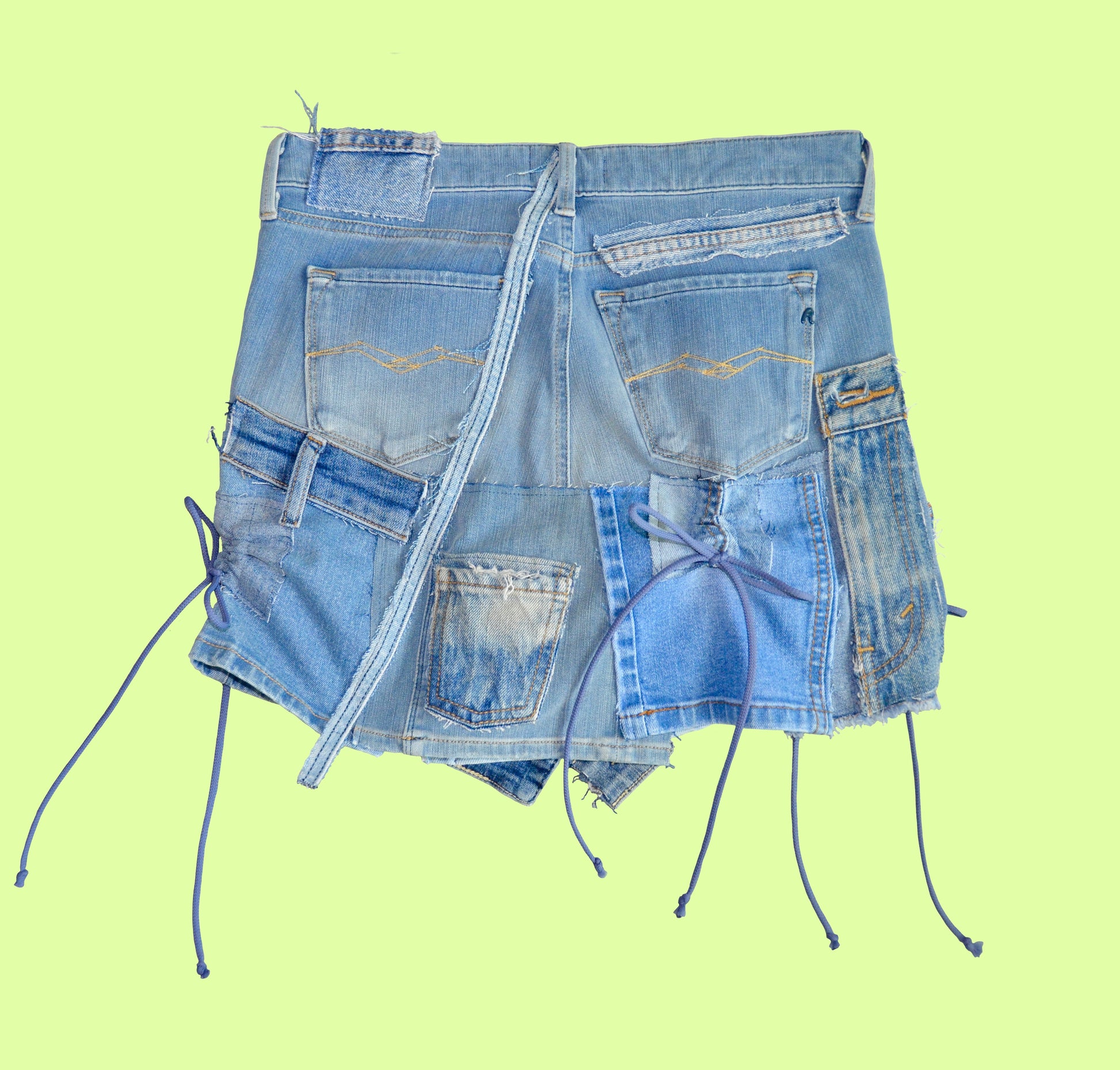 Handmade from recycled denim. Features 5 pockets and 2 functional mini-pockets. It has 3 adjustable blue cords. Like most of our products, this skirt is one-of-a-kind.