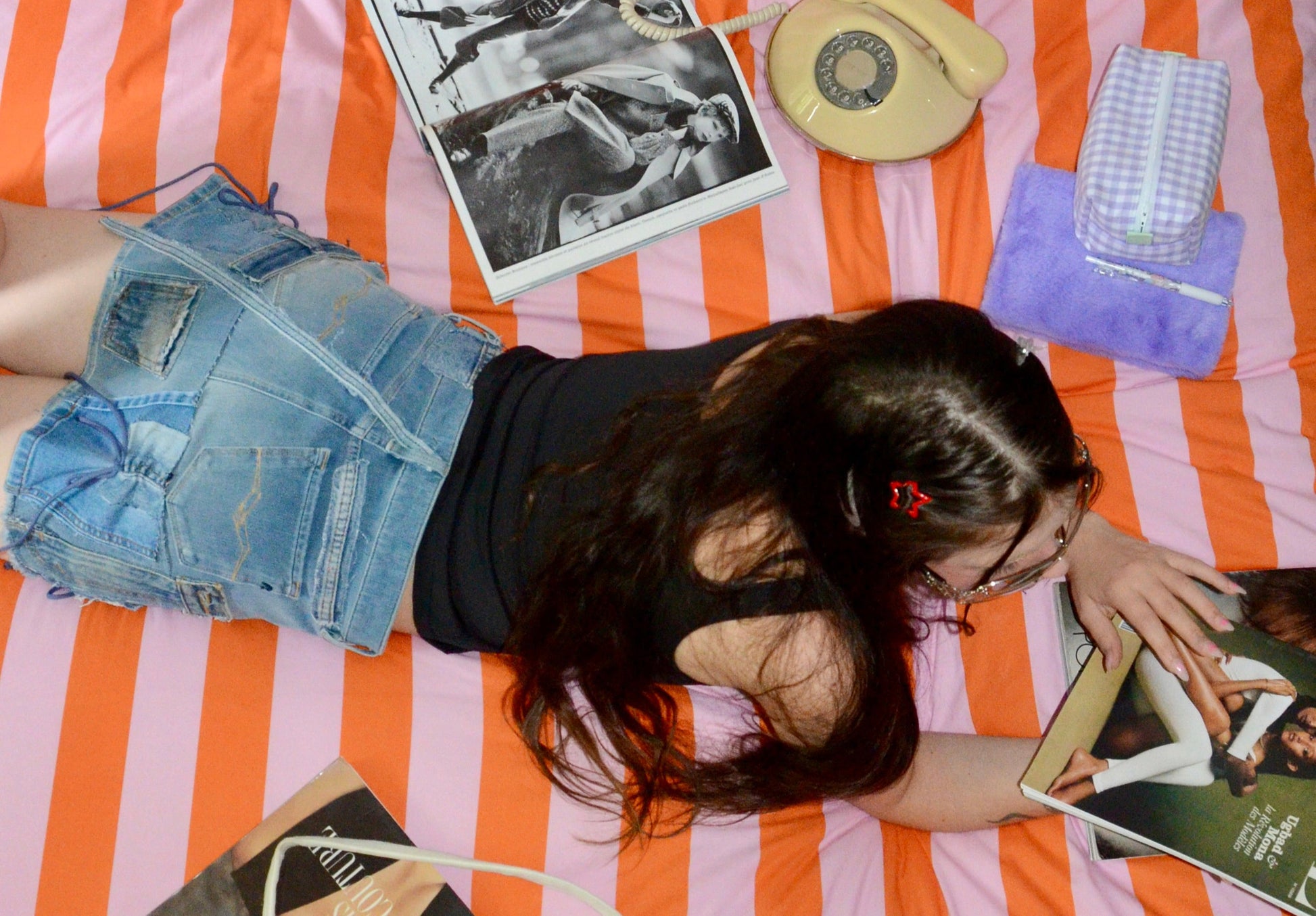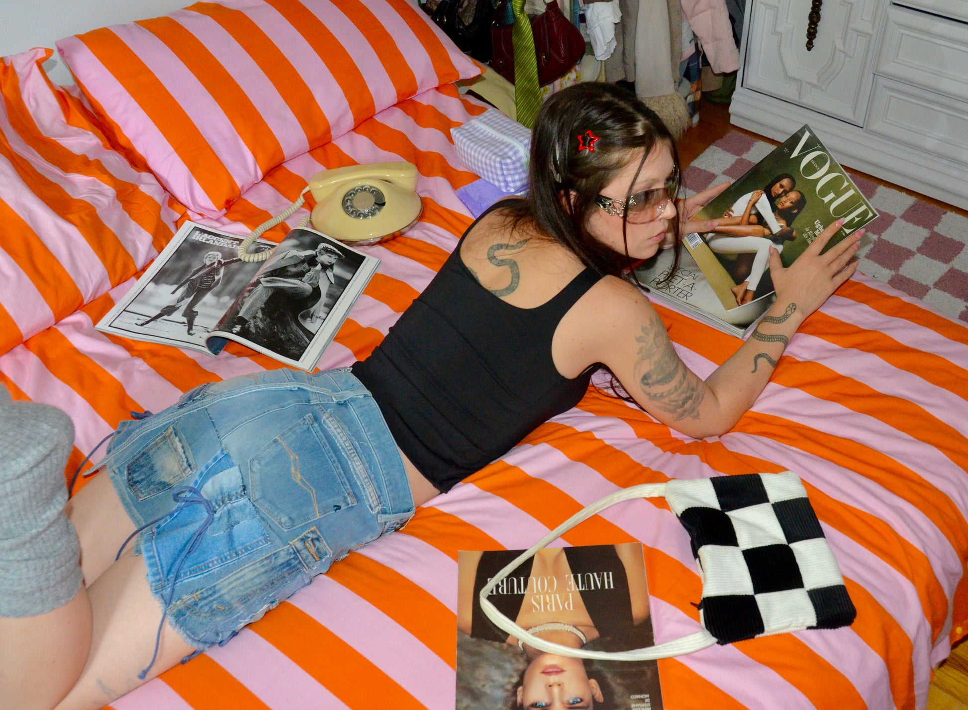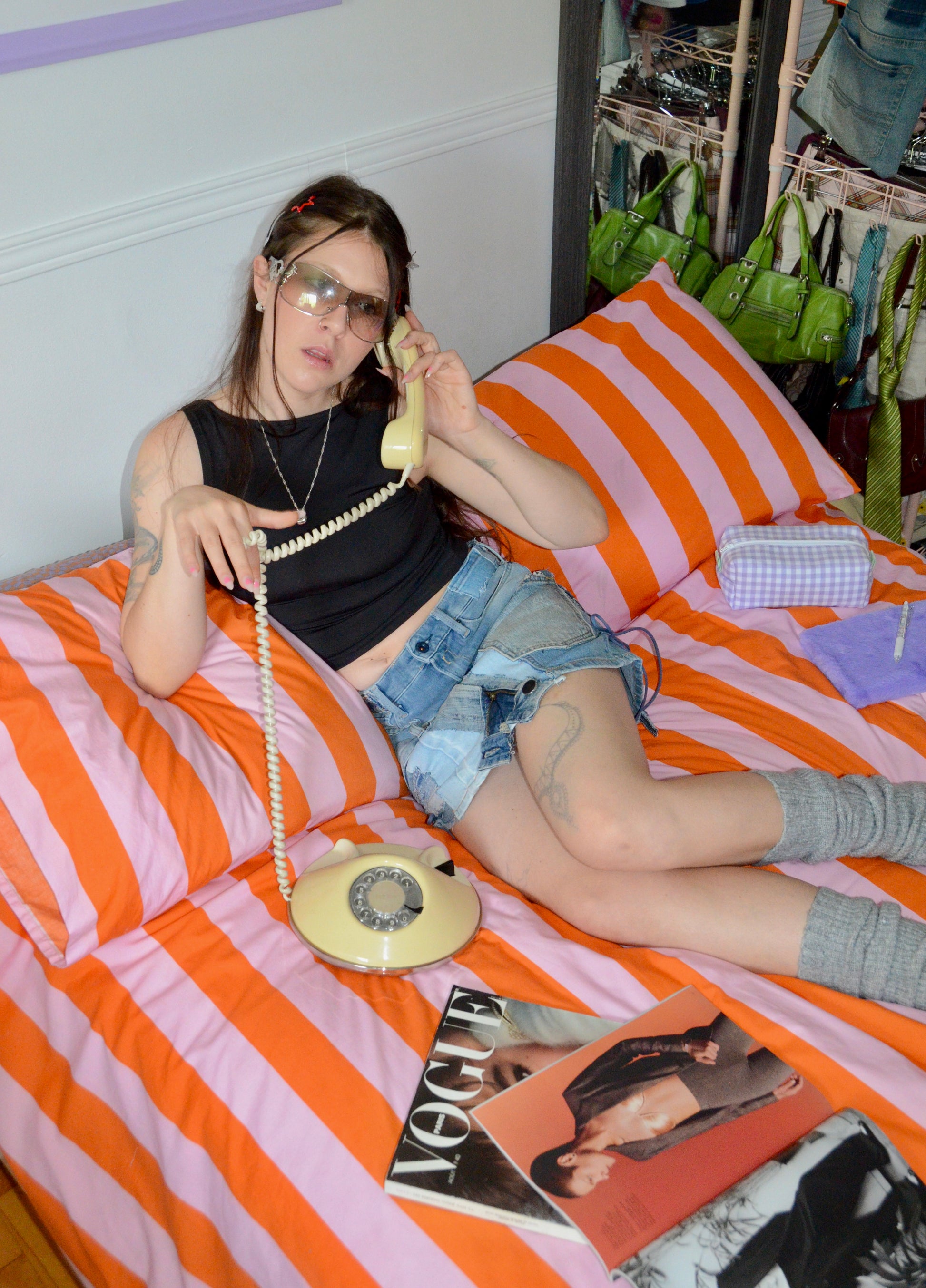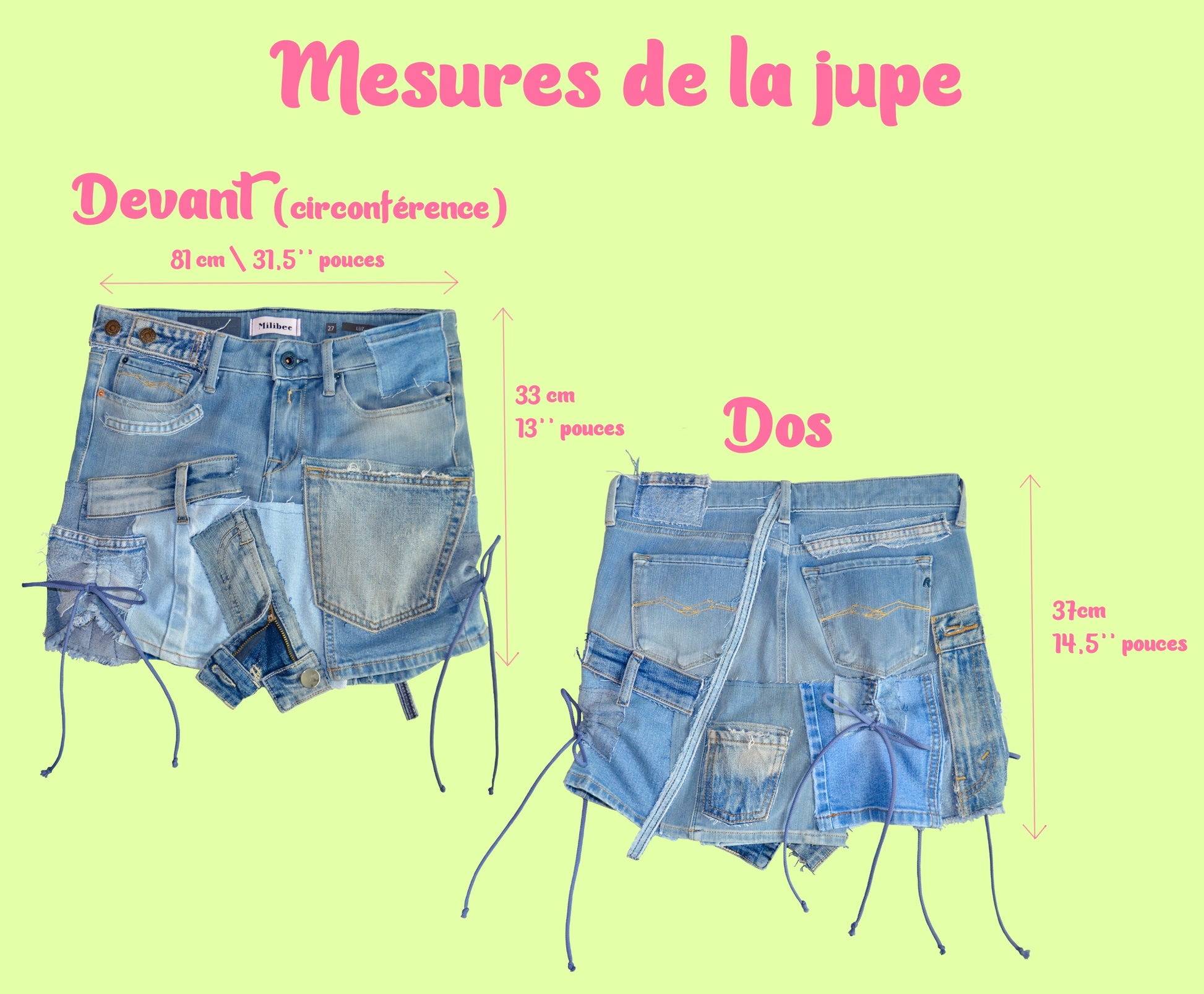 Handmade from recycled denim. Features 5 pockets and 2 functional mini-pockets. It has 3 adjustable blue cords. Like most of our products, this skirt is one-of-a-kind.