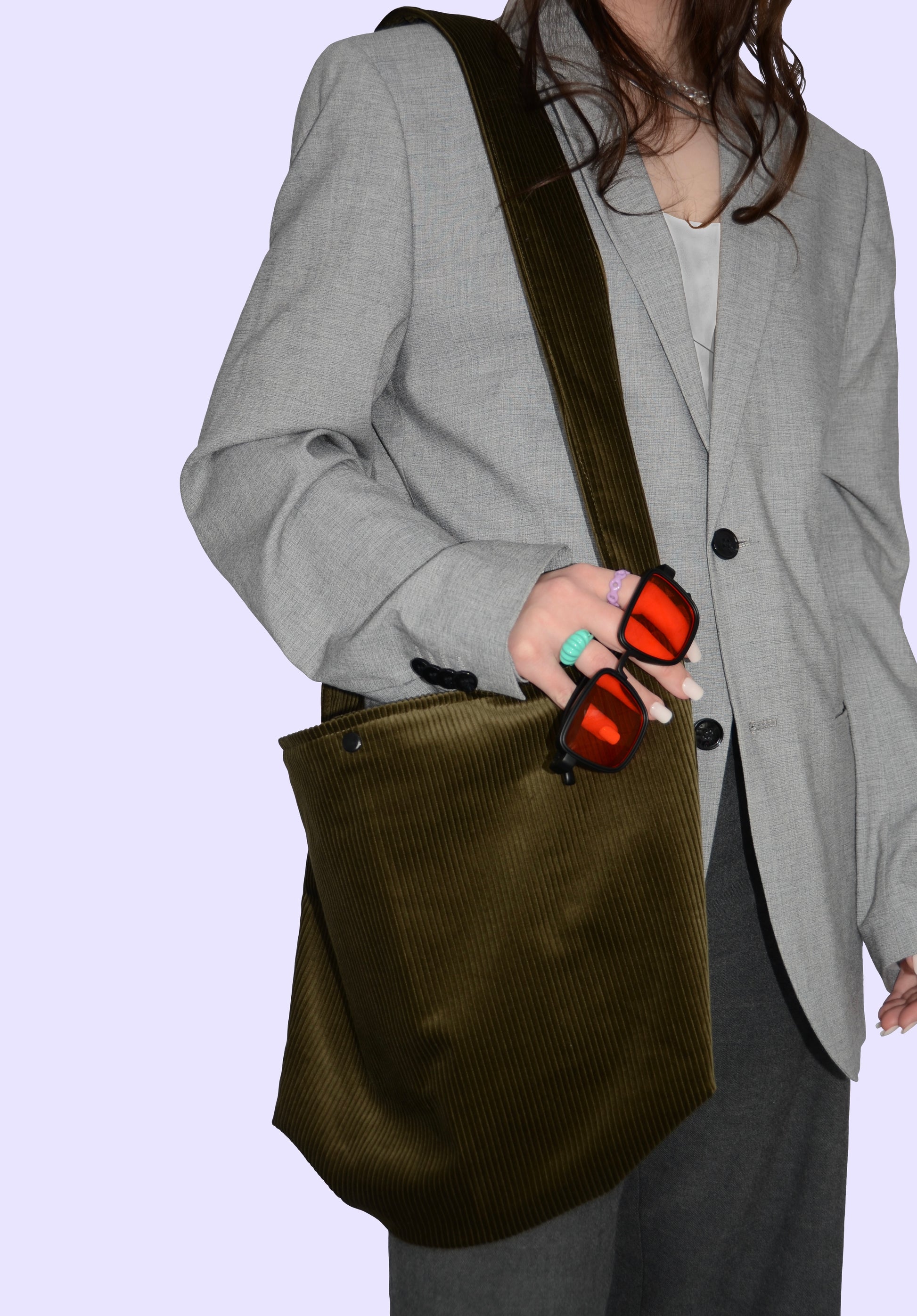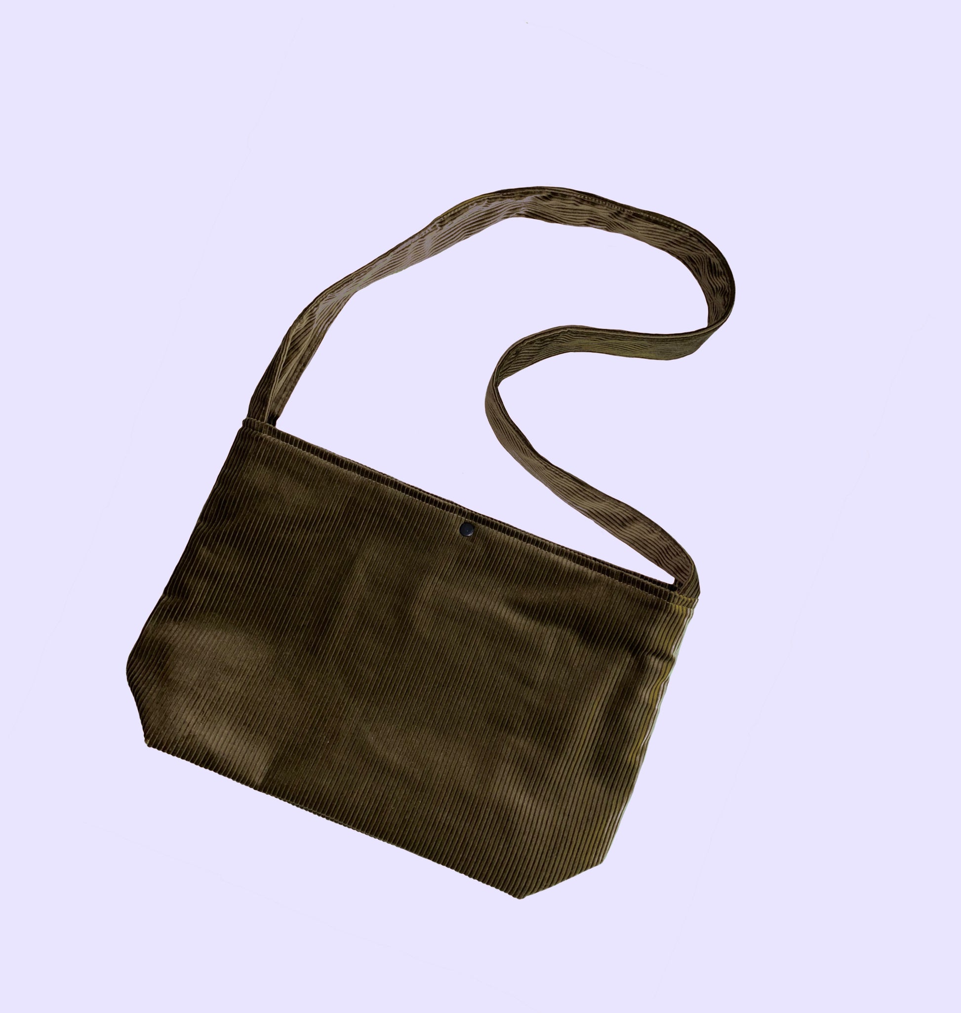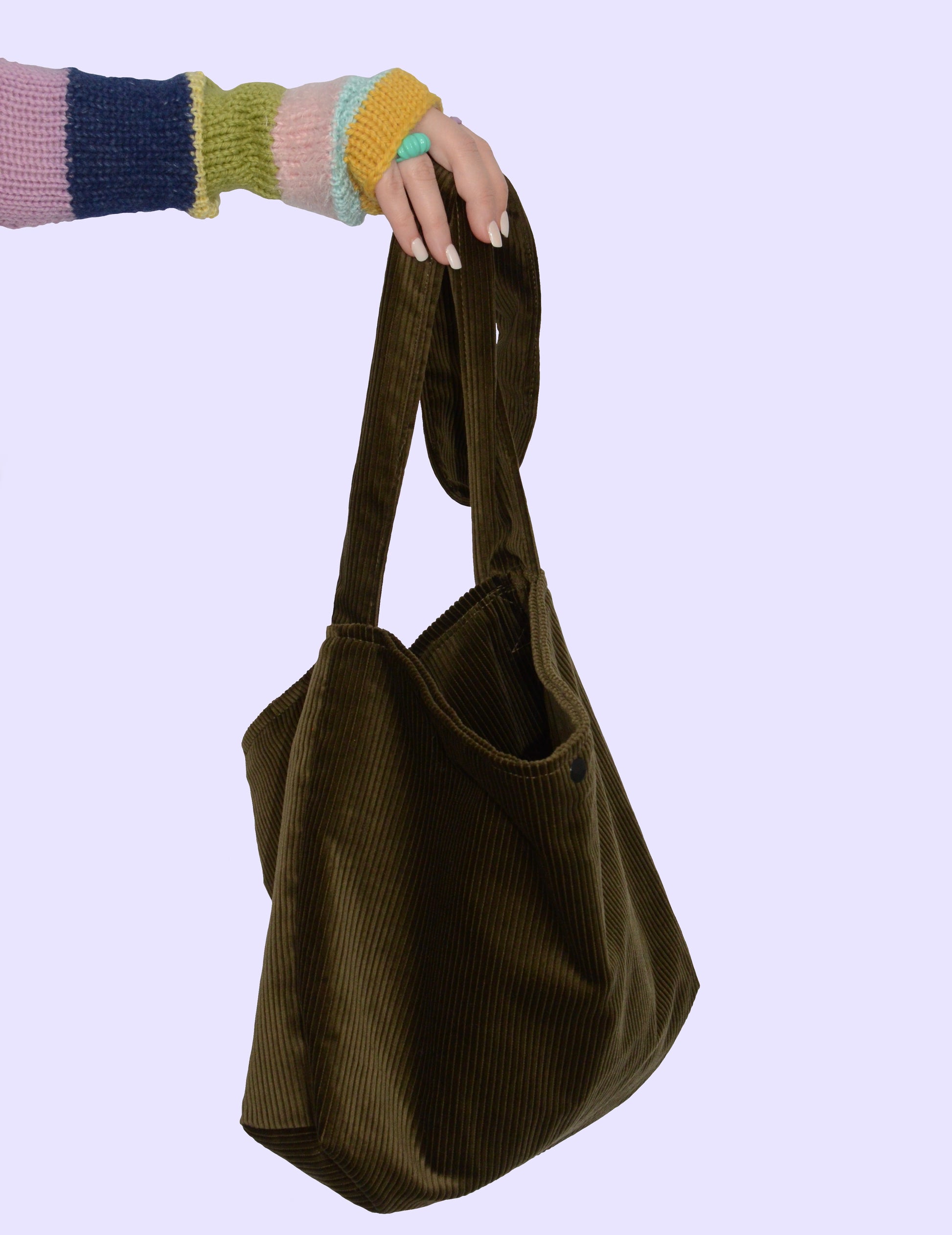 This khaki shoulder bag is made from recycled corduroy. Lining in the same fabric with a small internal pocket. The bag closes with a black snap button. It's the perfect "go-to" bag where you can fit all your personal belongings.