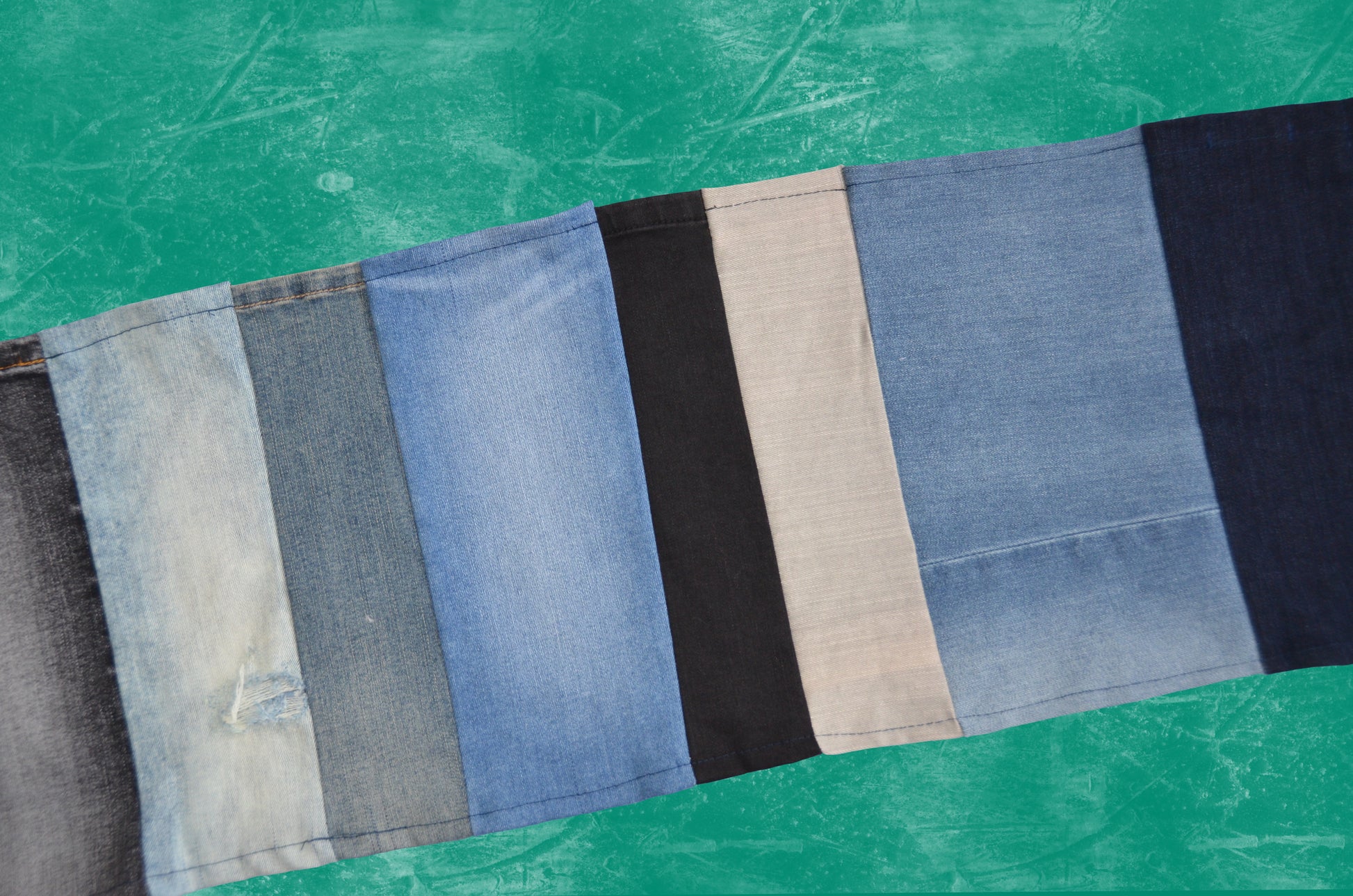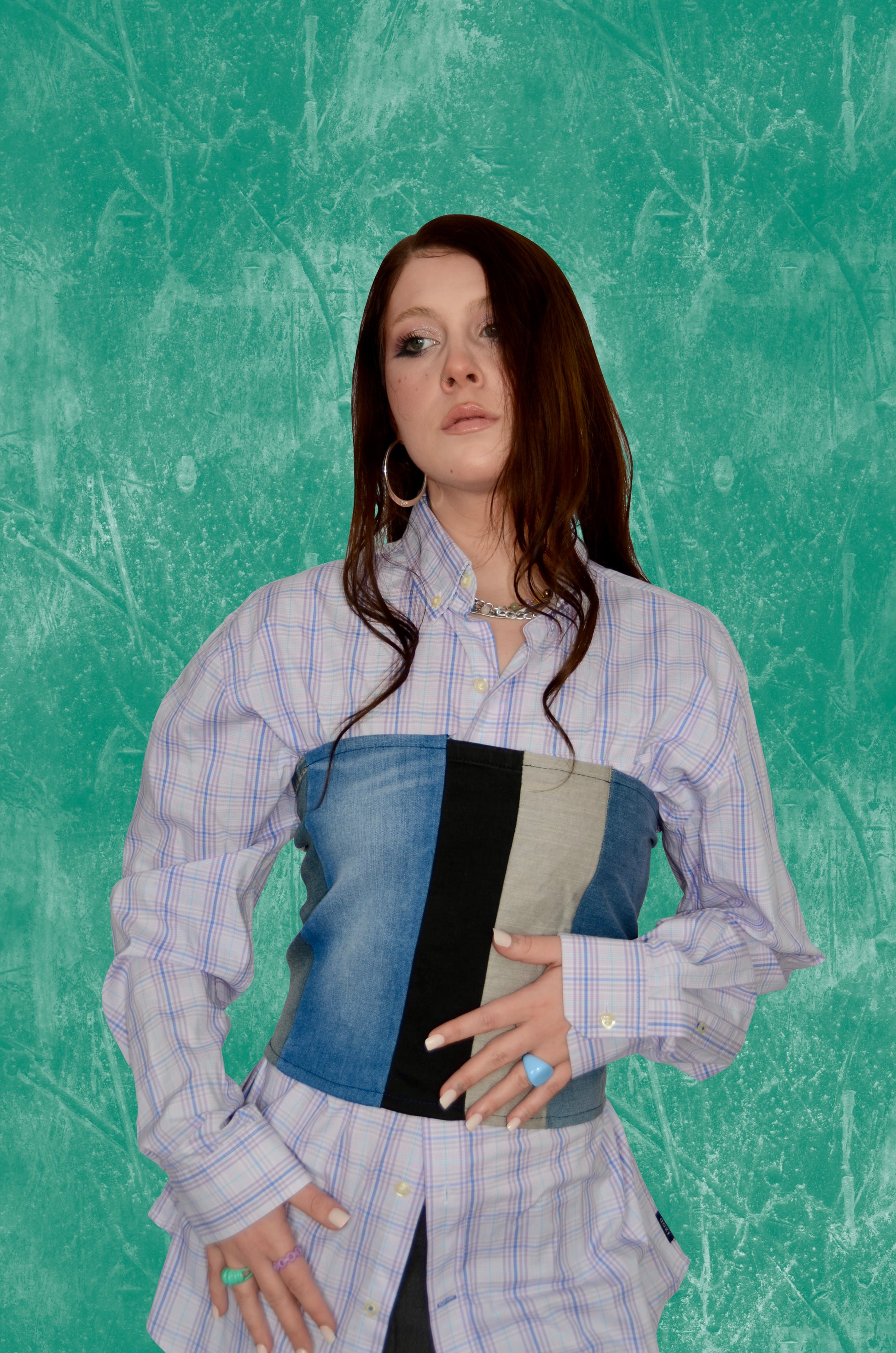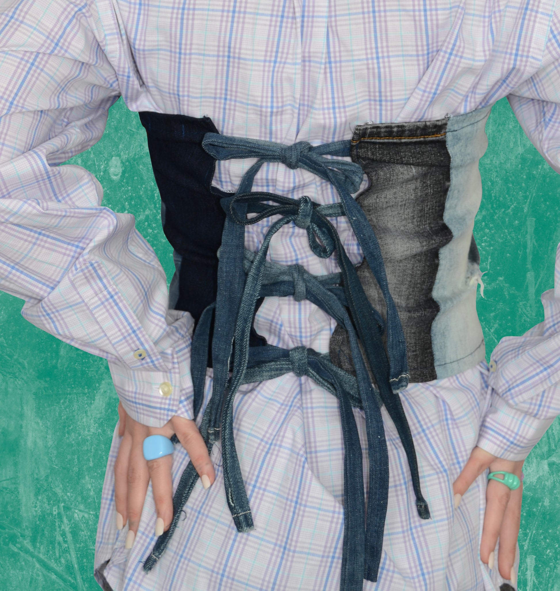 This corset was made from recycled jeans. It is adjustable with straps at the back. This item is unique. Only one available.