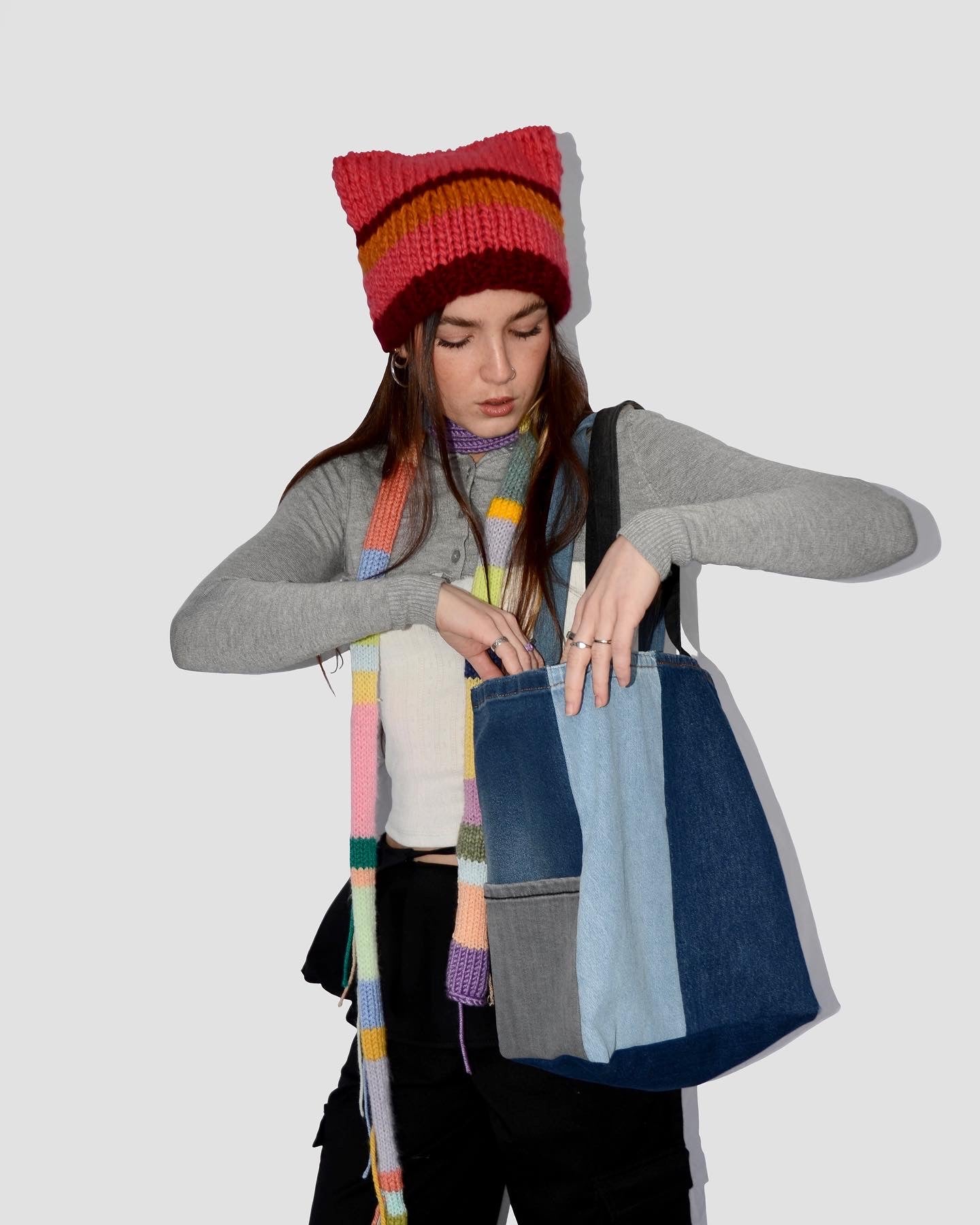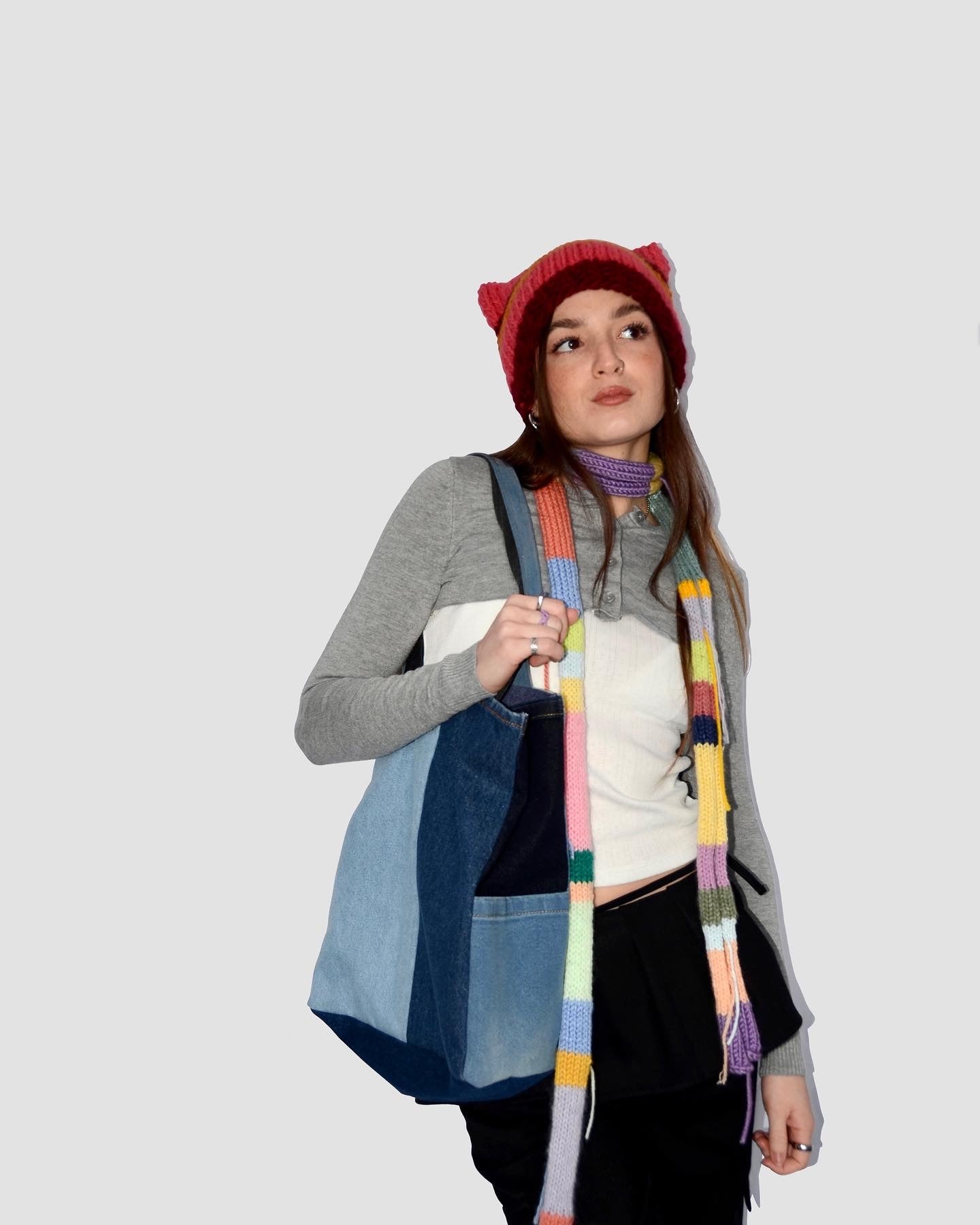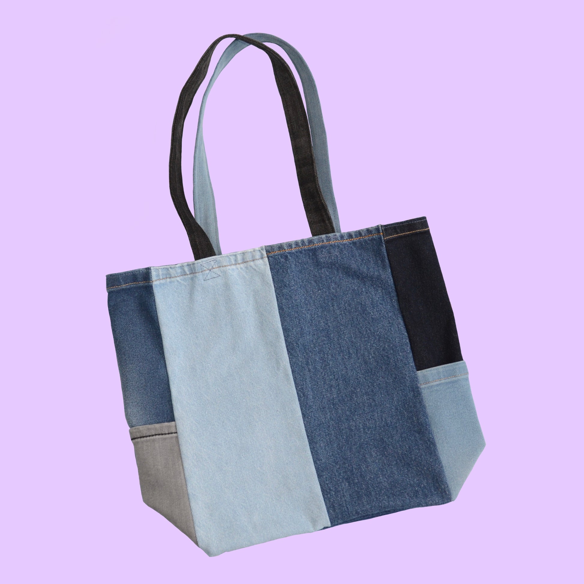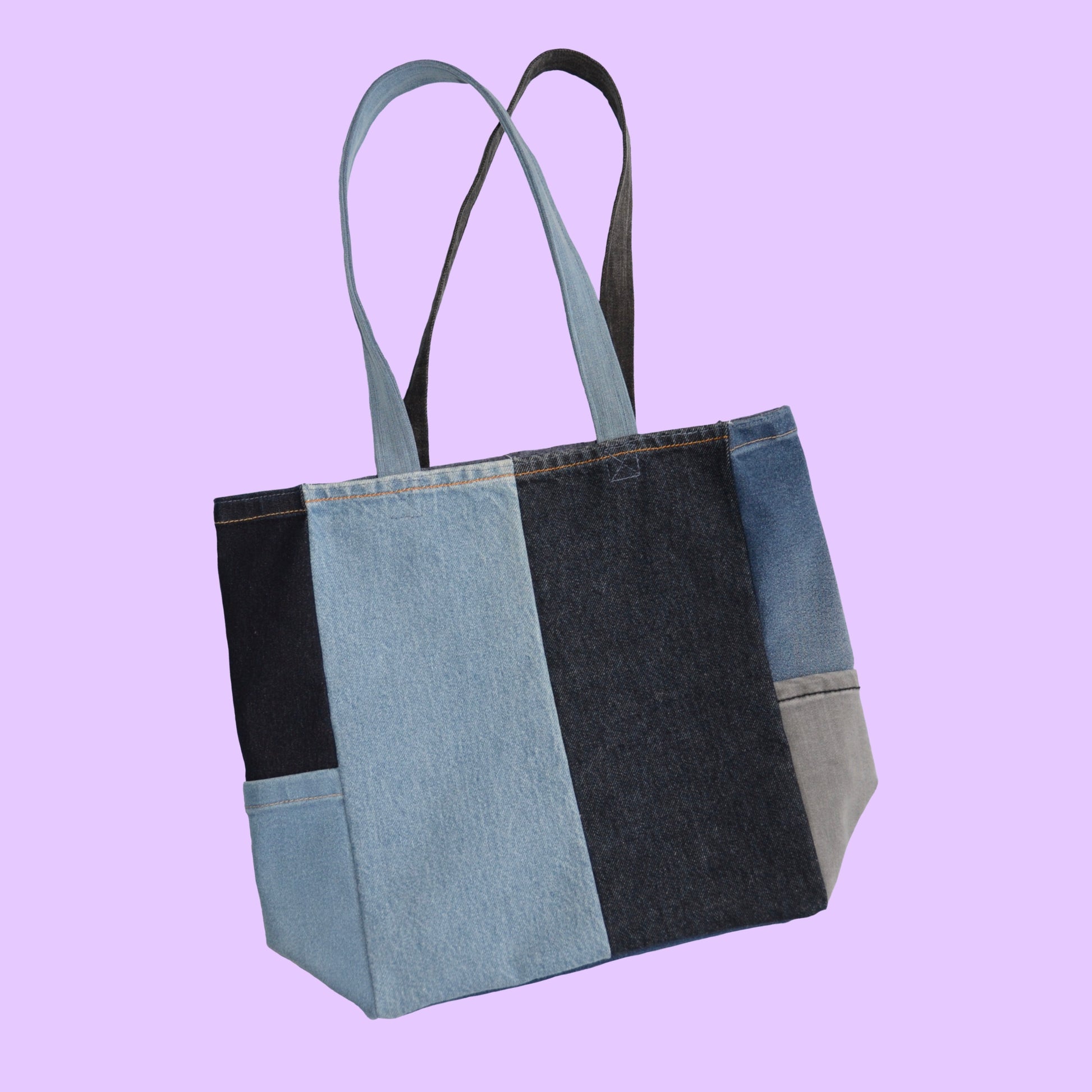 This tote bag is made with recycled jeans and have a pocket on both sides. Perfect size for doing your errands. This bag is unique. Only one available.