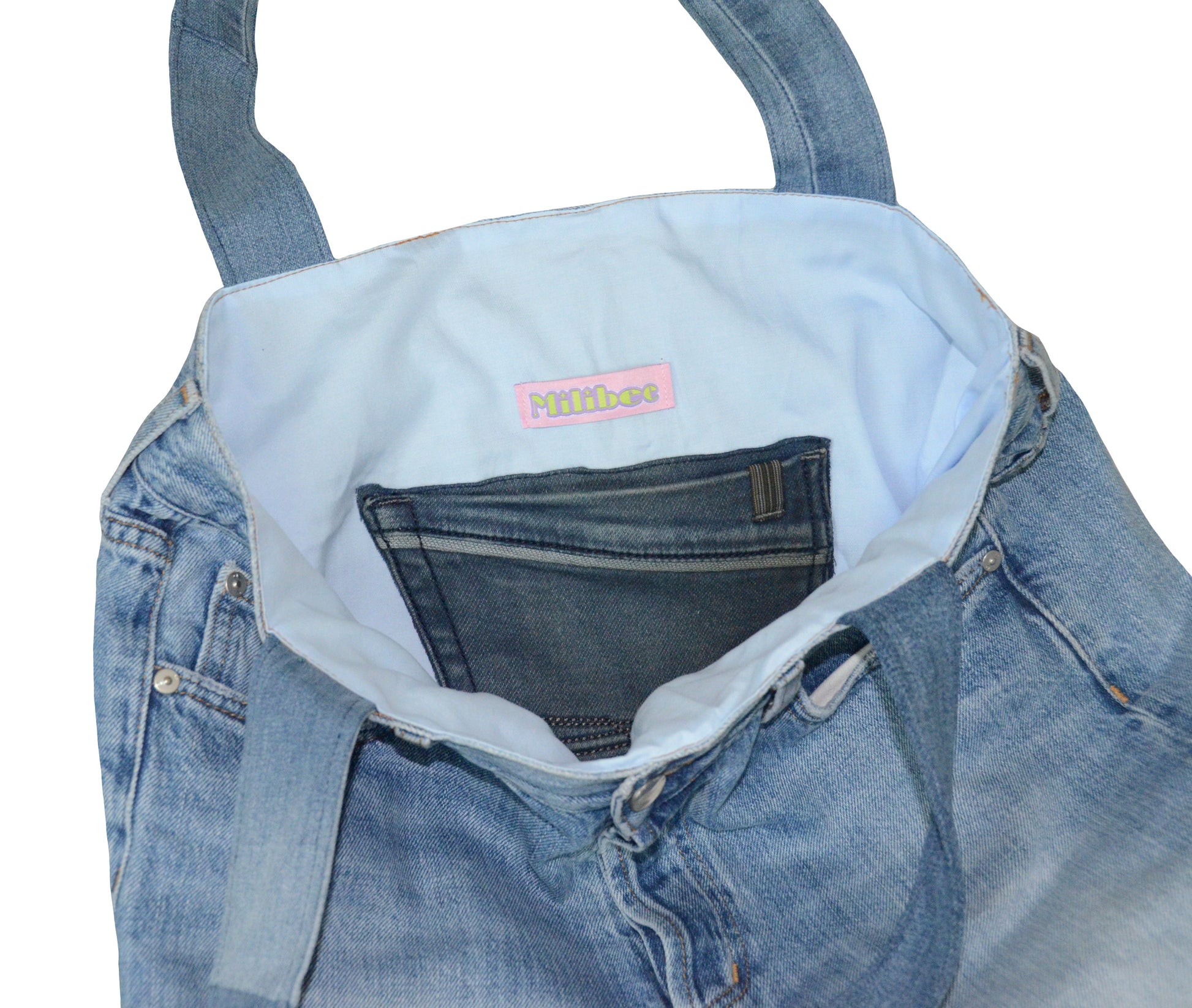 Made from recycled jeans and handmade in our workshop in Greater Montreal. This rectangular bag has a light blue lining with one internal pocket and five external pockets. The ideal size for carrying all your everyday essentials or for a day out.