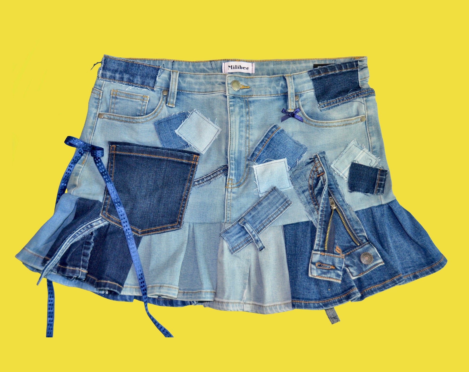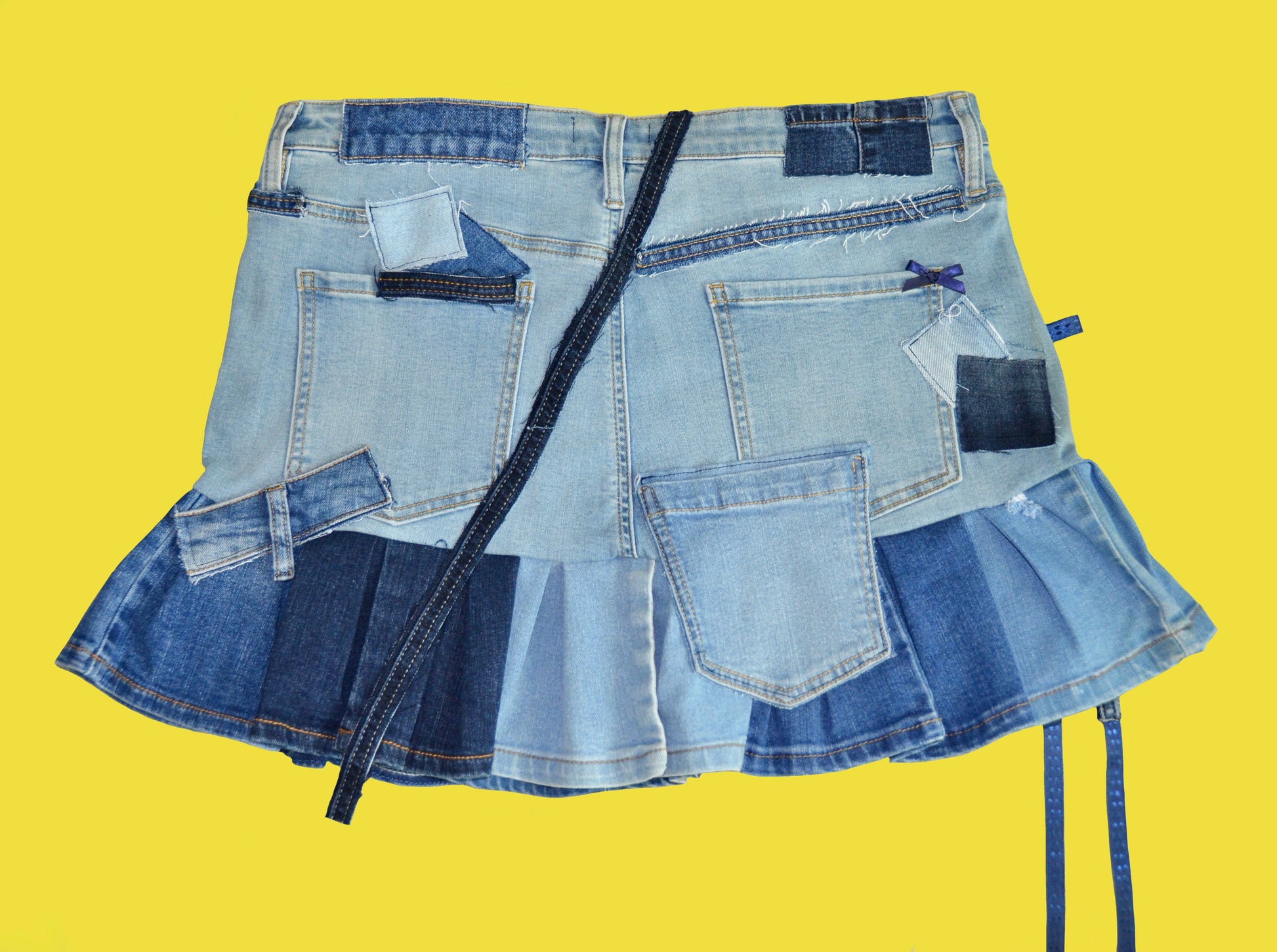 Confectionné à la main à partir de jeans recyclés. Elle est munie de 6 poches fonctionnels. Elle détient une boucle bleu sur le côté droit. Comme la majorité de nos produits cette jupe est unique.
