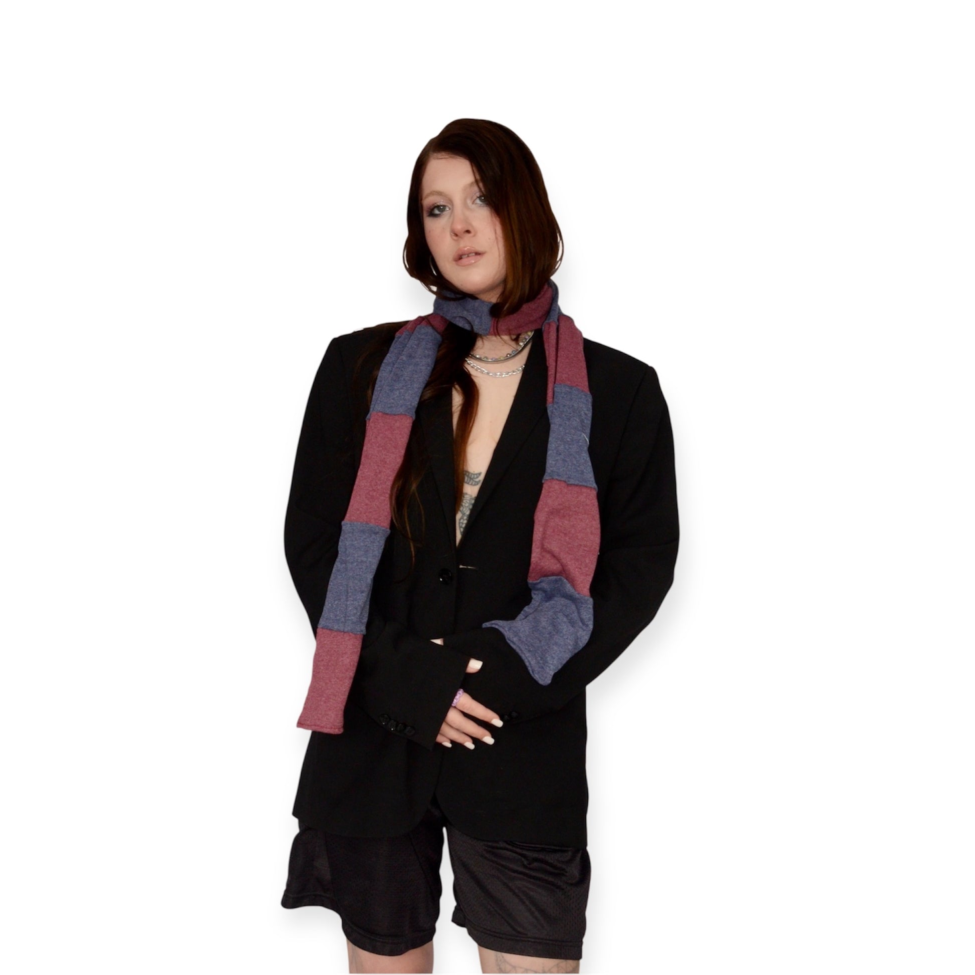 Cette longue écharpe bleu et bourgogne a été fabriqué à partir de tissus recyclés. Elle est confortable à porter.